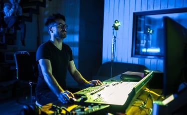 Profesjonalne studio nagrań audio z vocal boxami i możliwością odsłuchu dźwięku w formacie Dolby Atmos.